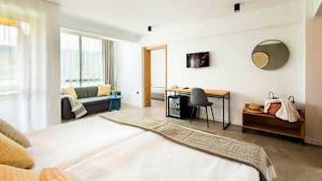 Moderne værelser med lys indretning.