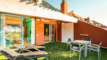 - Balkon (55 m²) med bruser og liggestole