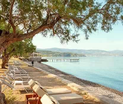 Stranden i Molivos består af sten, hvilket gør, at vandet er klart og rent, men et par meter ude i havet er der sandbund. På stranden er der mulighed for at leje liggestole og parasoller.