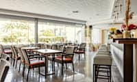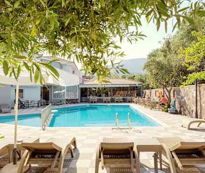 Hotellet har et hyggeligt poolområde med liggestole.