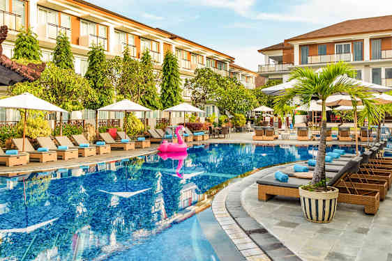 Kuta Beach Club Hotel ligger i hjertet af livlige Kuta Beach på Bali og er velegnet til dig, der gerne vil bo tæt på både strand og forlystelsesliv. Hotellet består af flere bygninger i moderne og balinesisk stil, der ligger spredt i en tropisk have med et skønt poolområde.