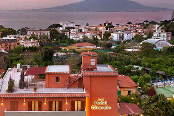 Girasole er et dejligt hotel med en romantisk atmosfære og smuk udsigt over Sorrentobugten og Vesuv. Hotellet har en stor og frodig have med et hyggeligt poolområde. Her er også en bar, der serverer et godt udvalg af lokale retter, is, sandwiches og hjemmebagte kager. Fra Girasole tager det ca. 20 minutter at spadsere til Piazza Tasso, hvor du finder både restauranter og shoppingmuligheder.