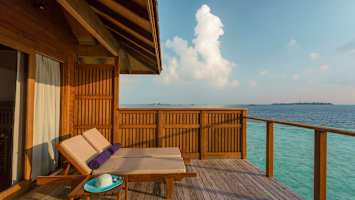 Står på stolper i havet med trappetrin ned i vandet. Fin terrasse med stole og borde samt liggestole. Jacuzzi Water Villas er ca. ca 85 m² inklusiv badeværelse og terrasse.