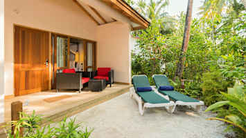 Ligger i hotellets have med fire eller fem værelser i hver bygning. Privat terrasse med stole og bord. I sandet uden for terrassen er der to liggestole pr. værelse.