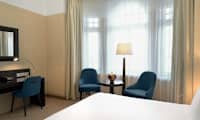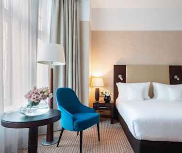 På hotellet finder man restaurant, bar, room service, fitness rum og konference