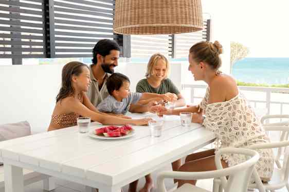 Den store have bliver omdannet til Happy Children Park – et nyt, indhegnet område med pools, sjove legezoner og masser af plads til både livlige vandlege og rolige pauser i skyggen. Her kan børnene boltre sig, plaske og gå på opdagelse i trygge, indbydende og inspirerende omgivelser.