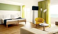 Hotellet har et fint poolområde med liggestole og parasoller samt pool- og strandhåndklæder. Fra poolområdet er der skøn udsigt over stranden og havet.